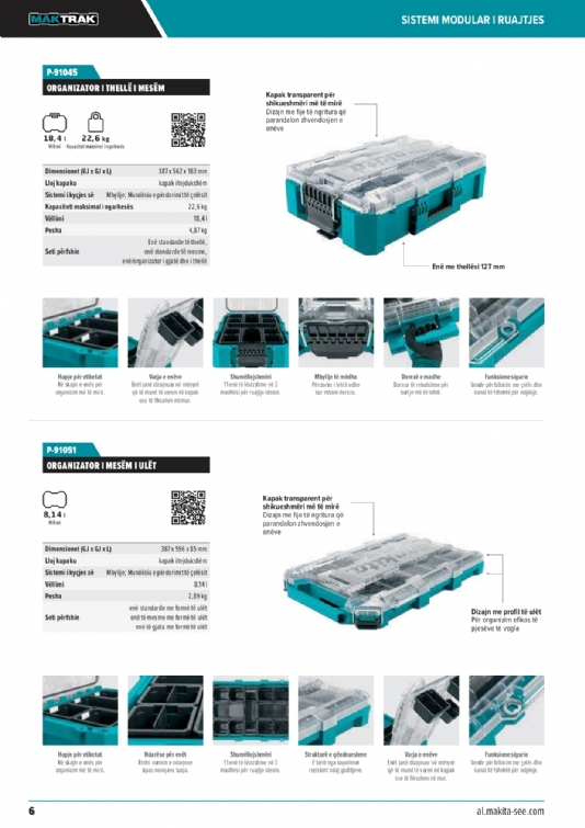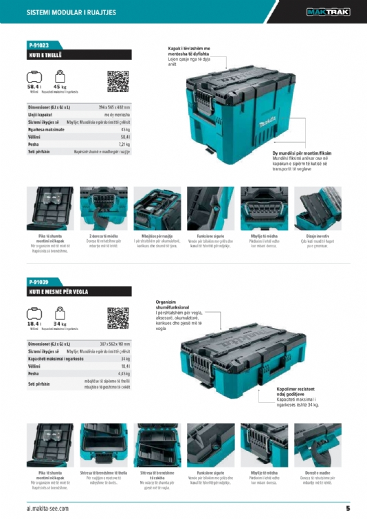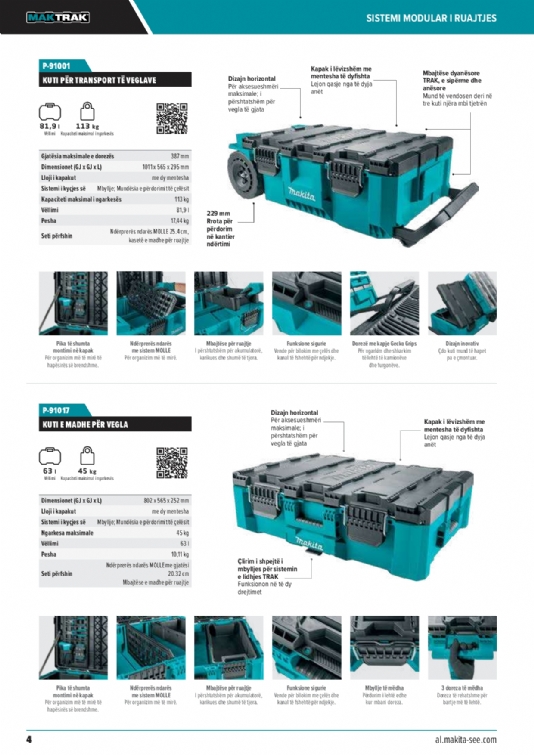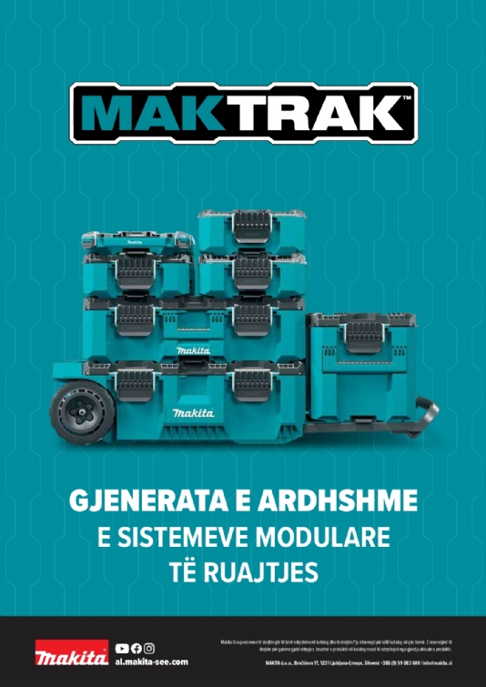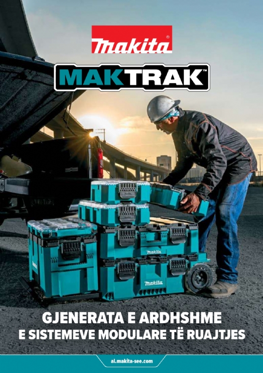 Ju prezantojmë gjeneratën e ardhshme të sistemeve modulare për magazinim - Makita MAKTRAK. Zgjidhja inteligjente e magazinimit përfshin kuti për vegla dhe organizues që mund të palosen, ofrojnë qasje të lehtë dhe mund të ngarkohen/ shkarkohen më lehtë në zonën e ngarkesës së kamionit ose furgonit.